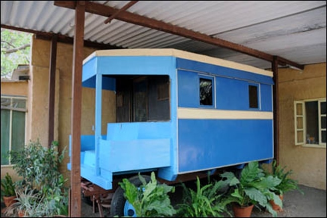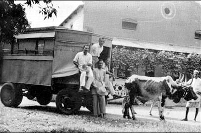 The body of the caravan was originally a bus. Viewed from the back the caravan looks like a motorized vehicle with huge truck tires. But from the front it resembles a large cart with a raised seat for the driver. The caravan was pulled by two bullocks. One was an English bullock named Raja that had been used to plow the fields around Meherazad, and the other was an Indian bullock that had been used at Meherabad.